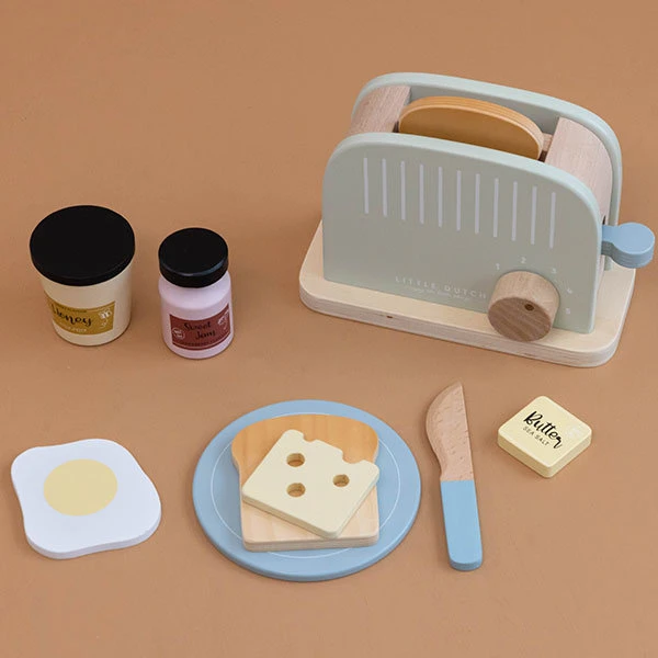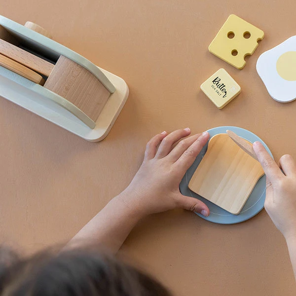Met deze houten broodrooster set Serveer je jouw ouders, of je favoriete poppen, een lekker ontbijtje. Doe de sneetjes brood in de broodrooster en duw de hendel naar beneden. Als de geroosterde boterhammen tevoorschijn komen, zijn ze klaar om te serveren. Voeg wat boter, kaas, marmelade of een gebakken ei toe om van het ontbijt een echt feestje te maken! In deze set vind je ook een houten bord en mesje. Kinderen vinden het heerlijk om de dagelijkse rituelen van hun ouders na te spelen, zoals het maken van het ontbijt. Deze broodrooster set stimuleert rollenspel en combineert mooi met het houten koffiezetapparaat.