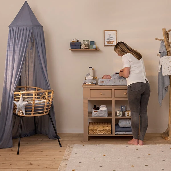 Met dit commodemandje in prachtig Sailors Bay Blue design van Little Dutch blijft de commode mooi opgeruimd en georganiseerd! Geen rondslingerende luiers, tubes en flesjes meer! De commodemand van is prachtig afgewerkt en biedt een opbergplek aan alle producten die je dagelijks nodig hebt om je baby te verzorgen. Met het stoere leren label en de zachte jersey stof is het een mooi accessoire in iedere babykamer.