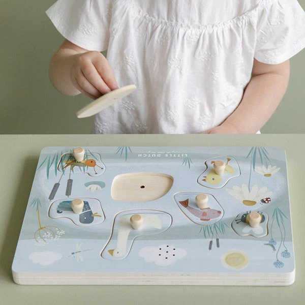 Geluidenpuzzel Little Goose is een prachtige houten inlegpuzzel met de dieren van de vijver. Maak kennis met Gans en zijn vriendjes. Herken hun vormen en unieke geluiden met deze leuke puzzel. Als je het diertje terugplaatst op het juiste plekje hoor je het plonsen, kwaken of zoemen. Ontworpen voor je kind om de levende wezentjes rond de vijver op het platteland te leren kennen. Deze puzzel met 7 diertjes en geluiden bevordert de oog- hand coördinatie en stimuleert de woordenschat van je kindje. De sensoren reageren wanneer het puzzelstukje wordt teruggeplaatst. Batterijen (2 x AAA) niet inbegrepen.