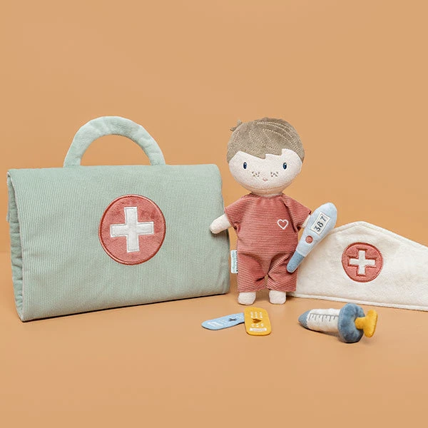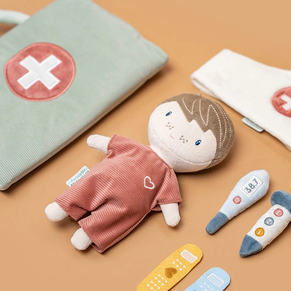 Deze verpleeg speelset voor pop Jim zorgt voor vele uren rollenspel. De speelset bevat een mooie pop en allerhande basisbenodigdheden om de behandeling van een patiënt na te spelen. Doe de pyjama van de pop aan, meet de temperatuur, gebruik de spuit en verzorg de wond met pleisters. Kinderen helpen graag met het verplegen en verzorgen van hun knuffels. Deze speelset neem je overal makkelijk mee naar toe.