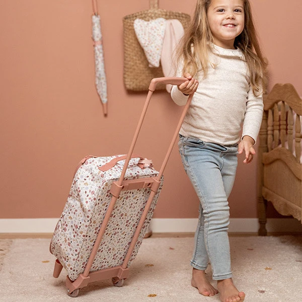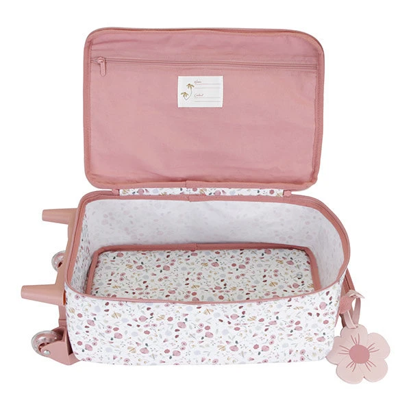 Deze kinderkoffer in prachtige Flowers & Butterflies design van Little Dutch is super handig om mee te nemen op vakantie of wanneer je kindje gaat logeren. Het koffertjes heeft twee wieltjes en twee pootjes onderaan en sluit met een dubbele ritssluiting. Bovenop de reiskoffer vind je een draaglus en een uitschuifbaar handvat. Binnenin heeft de koffer een binnenvak met rits voor het opbergen van kleine spullen. Een leuke toevoeging aan deze kinderkoffer is het bagagelabel gemaakt van rubber, ideaal voor het notreren van je contactgegevens. Dit kan je ook doen op het gestikte label aan de binnenkant van de reiskoffer.