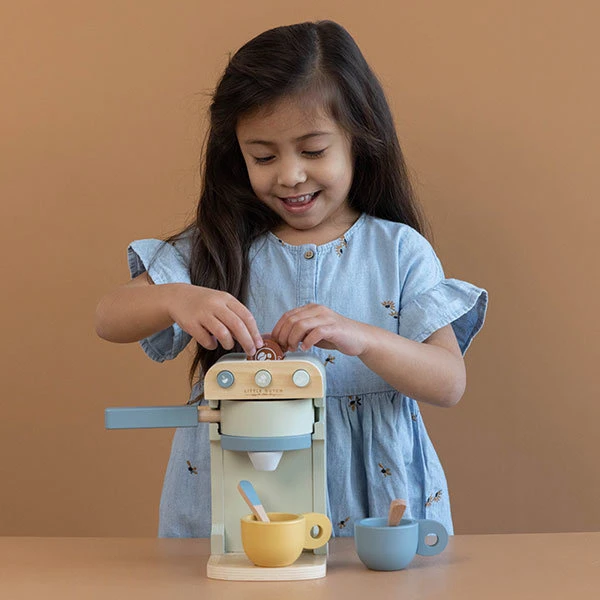 Met dit leuke koffiezetapparaat wil je het liefst de hele dag kopjes koffie maken. Breng ’s ochtends een vers kopje koffie naar je vader en moeder.. Of nodig je favoriete poppen uit in je kleine koffietentje. Er zitten twee kopjes, twee lepels en vijf verschillende koffiepads bij dit houten koffiezetapparaat. Wil je een lungo, cappuccino, latte macchiato, gewone koffie of espresso? Kinderen vinden het heerlijk om de dagelijkse rituelen van hun ouders na te spelen, zoals het maken van een lekker kopje koffie. Deze koffieset stimuleert rollenspel en zal de mini-barista in je kleintje naar boven halen. Combineer met de houten broodrooster om er een complete ontbijt beleving van te maken.