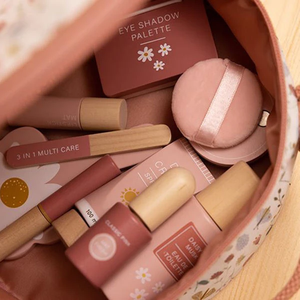 Met deze prachtige make-up tas maken kinderen zich net als mama helemaal mooi! Kinderen leren door te imiteren. Inspireer tot fantasierijk spelen met deze mooie beautycase. Het tasje heeft een kleurrijk bloemenpatroon en is gevuld met 10 houten speelgoedproducten. Zo is er een handspiegel, een parfumflesje en een tube crème. De set bestaat daarnaast uit lippenstift, nagellak, gezichtspoeder, poederdonsje, oogschaduw. mascara en een nagelvijl. De beautycase van Little Dutch zorgt voor speelplezier, zonder de rommel van echte make-up! Geschikt vanaf 3 jaar.