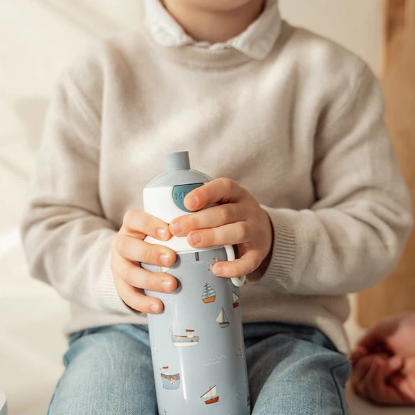 De Mepal drinkfles pop-up 400ml met prachtig Sailors Bay design is super handig voor jonge kinderen. Drinken doe je met één druk op de knop, druk nogmaals en de drinkfles is weer dicht. Anti-lek en makkelijk gebruiken zonder hulp van een volwassene. De drinkfles is goed schoon te maken en te combineren met de bijpassende lunchbox en rugzak. Wij adviseren de deksel goed schoon te maken voor gebruik, zodat de deksel beter sluit en popt.