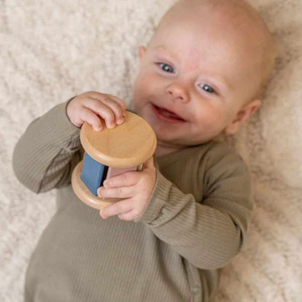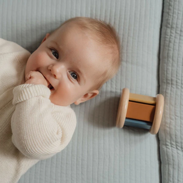 Deze rammelaar roller in prachtige Vintage kleuren is super leuk babyspeelgoed. Laat de rammelaar rollen en hoor het belletje rinkelen. De rammelaar is makkelijk te pakken voor kleine handjes. Schud de rammelaar heen en weer voor nog meer vrolijke geluidjes. Met deze rammelaar bevorder je de hand-oogcoördinatie van je kindje.