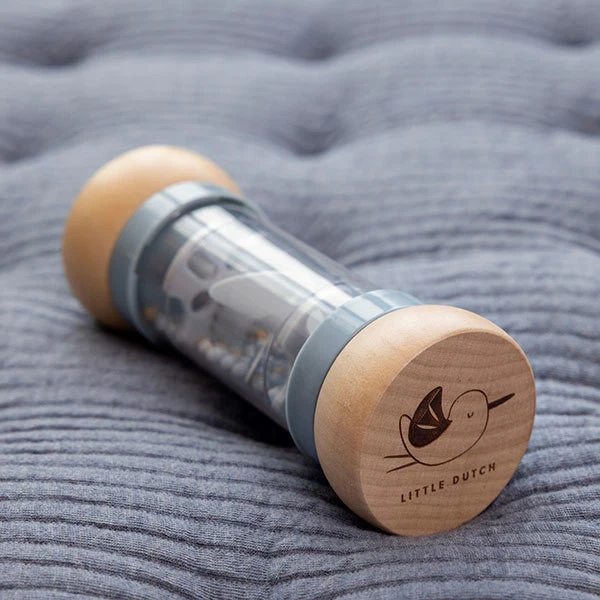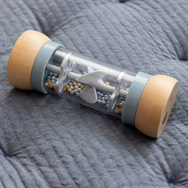 Regenrammelaar Sailors Bay is super leuk baby speelgoed. De rammelaar stimuleert de zintuigelijke ontwikkeling en het muzikale talent van je baby. Schud en rammel! Draai de regenrammelaar om en luister naar de rustgevende druppelgeluidjes van de balletjes die van de ene naar de andere kant van de regenmaker bewegen. De balletjes, in 3 verschillende kleuren, vallen door kleine openingen in de buis en laten de propeller draaien, wat resulteert in een aangenaam geluid. De regenrammelaar is ontworpen voor kleine handjes en ligt lekker in de hand. De houten boven- en onderkant zijn versierd met een tekening van een zeilboot en zeemeeuw uit de Sailors Bay collectie.