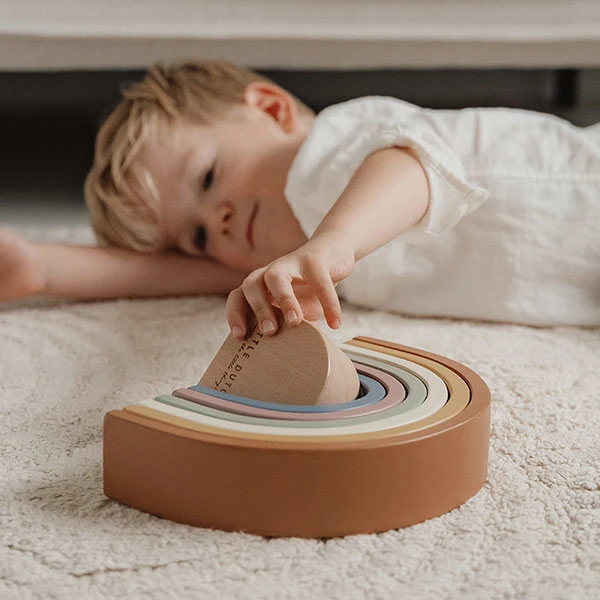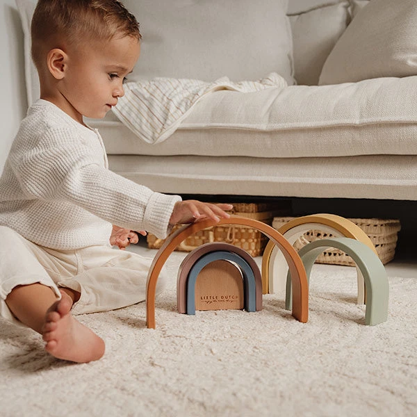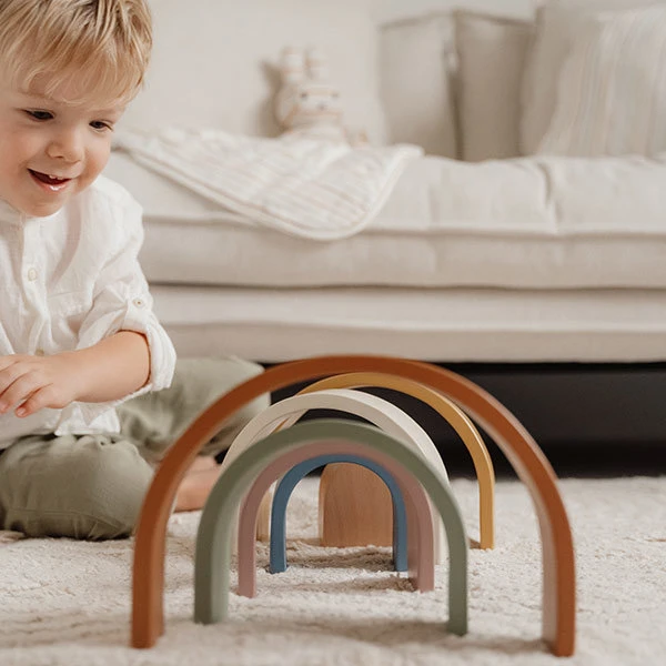 Met deze houten regenboog in prachtige vintage kleuren kunnen kinderen stapelen, sorteren en bouwen! Er zijn zoveel creatieve manieren om met deze regenboogstapelaar te spelen. Niet alleen om hem als regenboog te stapelen, maar ook om sculpturen te bouwen of een tunnel voor treinen en auto’s te maken. Gebruik je fantasie en je zult eindeloze ideeën vinden om met de bogen van deze regenboog te spelen. Deze houten vintage regenboogstapelaar stimuleert het fantasierijke spel van je kleintje en bevordert de fijne motoriek, je zult versteld staan van de veelzijdigheid van dit speelgoed. Om nog maar te zwijgen over hoe geweldig het zal staan in de kinderkamer.